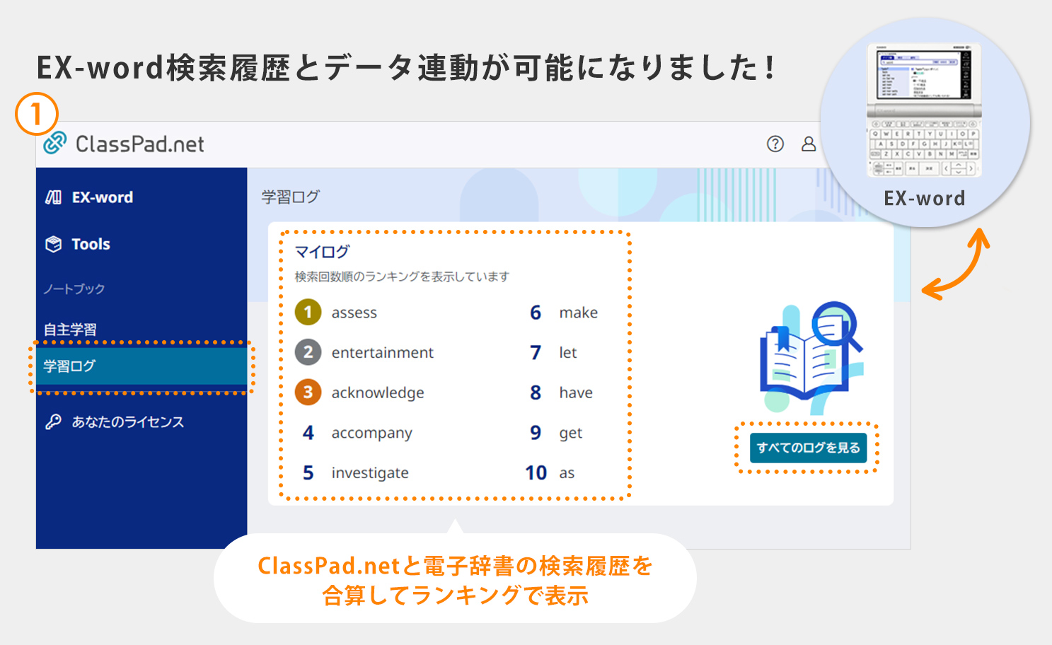 学習ログ機能から、お持ちの電子辞書EX-wordで検索した履歴が、ClassPad.netで検索した履歴と一緒に確認できるようになりました。