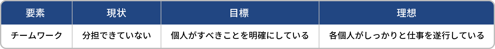 理想と現状が明確になった後に、最後はその間にくる「目標」を設定する。例えば、上の「チームワーク」の例で言うと、この目標は【個人がすべきことを明確にしている】となった。このようにグループで、要素と、その要素に対する「理想」と「現状」、さらにはその間に位置付ける「目標」を順番に言語化していく。