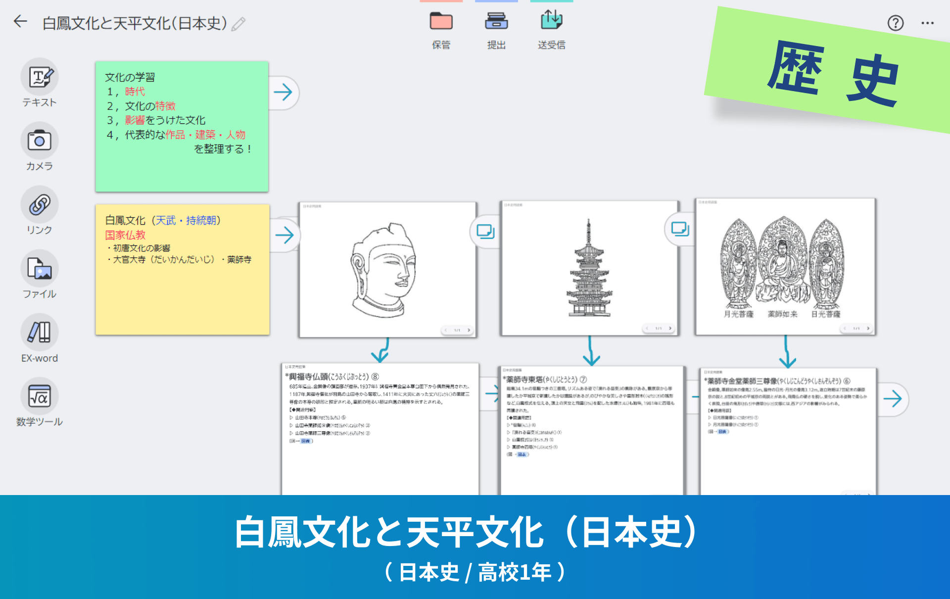 画像やPDFファイル、リンクふせんなどを使い、自分で調べてノートにまとめることで思考力を高めることができます。
