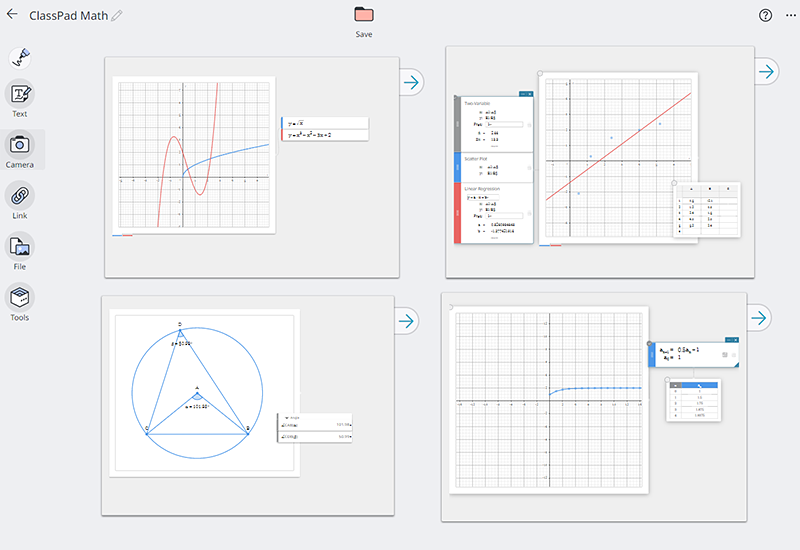 ClassPad.net ayuda a los usuarios a comprender las matemáticas de forma visual, ya que ofrece un control intuitivo y sencillo de diversos gráficos, funciones de creación de formas, estadísticas y cálculos. Los usuarios también pueden publicar cualquier material educativo de matemáticas que hayan creado para que lo vean usuarios de todo el mundo a través de URL.